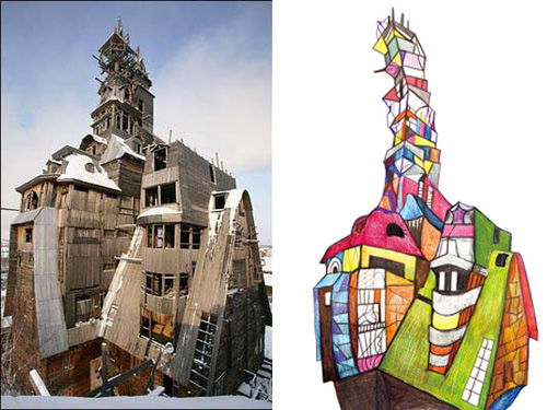 今日は、書籍「デザインの深読み」で取り上げた、バッドデザイン(エットーレ・ソットサスが「グッド・テイスト」というブルジョワ的な価値観に抵抗し、アンチ・デザインを宣言していた。http://bit.ly/fqhwez )の典型的な建築。いわゆるゲテモノの類に時折惹かれる。場所はロシアの北西部にある街で、北ドヴィナ川の河口近くに位置する港町だ。その昔、ロシアの主要な輸出品であった木材の積み出し港として栄えたそうだ。13階建ての木造タワーは、その時代からあった名物、というわけではない。なんと、Nikolai Sutyaginという実業家が1992年から自宅を増築して作ってしまったものだ。本人いわく「市内のホテルは、私の顧客や関係者を泊らせるのには快適ではない」というのが主な理由。