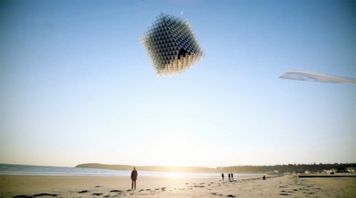 このキューブは"The Three Cubes Colliding"と名付けられました。英国のWestinster大学の学生、SashとIvan Morisonが思いついた実験的なデザインです。お気づきの方もいらっしゃると思いますが、凧なのです。